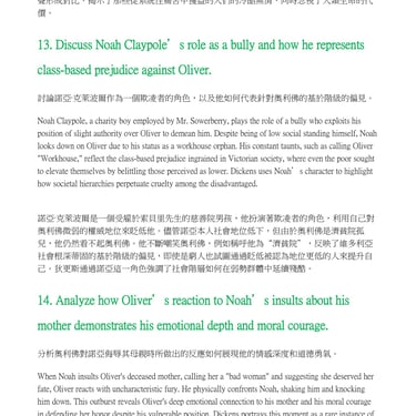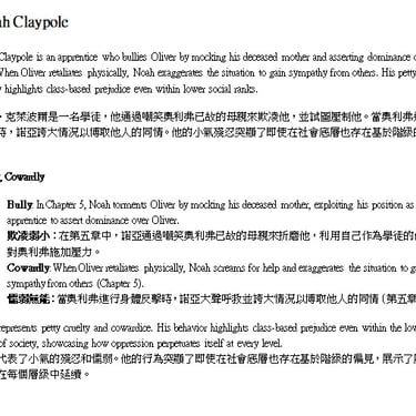Oliver meets Noah Claypole, another boy employed by Mr. Sowerberry who bullies him constantly. During one meal, Noah insults Oliver’s deceased mother: “Your mother was a bad woman… It’s a good thing she died when she did.” Enraged by this insult, Oliver attacks Noah but is beaten by Charlotte (a servant) and Mrs. Sowerberry before being locked in the cellar. Mr. Bumble blames Oliver’s behavior on being fed too much meat instead of soup.